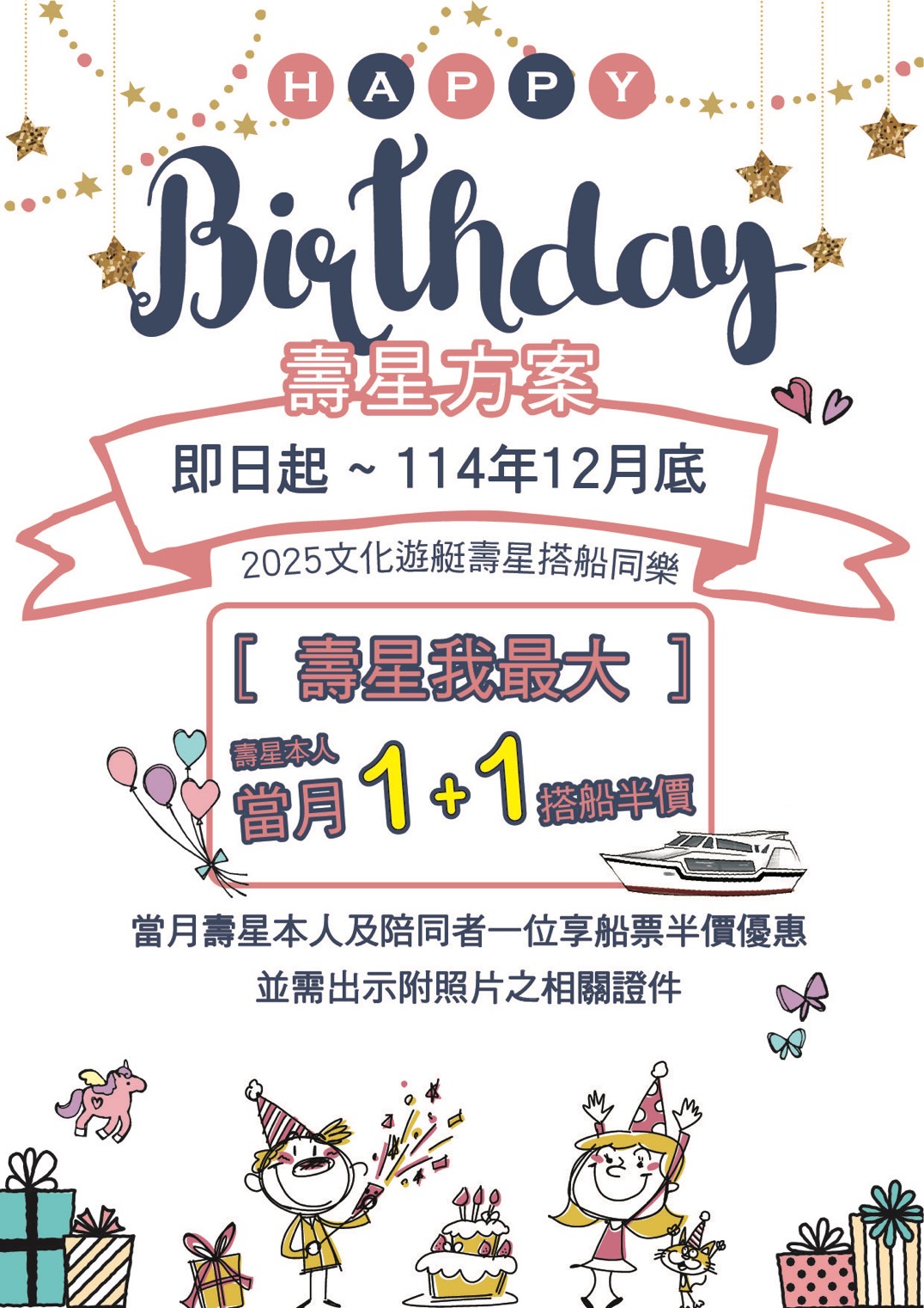 4.優惠內容:壽星本人及陪同者一名享文化遊艇船票半價優惠。(如須購買園區門票請依現場資格規定購買。)